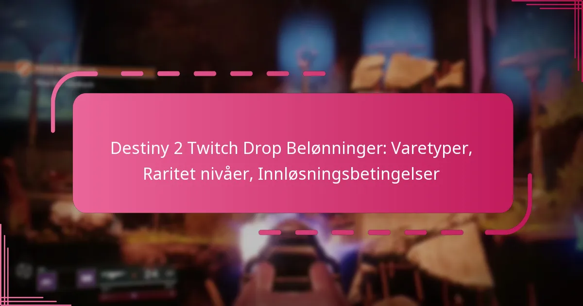 Destiny 2 Twitch Drops gir spillere en rekke in-game gjenstander, inkludert våpen, rustningssett og kosmetikk, ved å se på bestemte strømmer. Disse belønningene varierer i sjeldenhet fra Vanlig til Eksotisk, hver med unike fordeler og tilpasningsmuligheter. For å kreve disse belønningene må spillere koble sammen sine Twitch- og Bungie-kontoer og se på kvalifiserte strømmer i en bestemt tidsperiode, hvoretter de enkelt kan kreve sine gjenstander gjennom Twitch.
